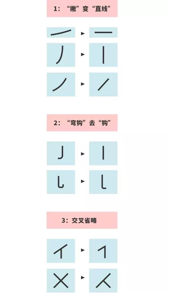 常用中文字体有3500多个,我们不可能写出所有字体的“减法”设计方法,为笔画做“减法”,以下三种情形最为常见: