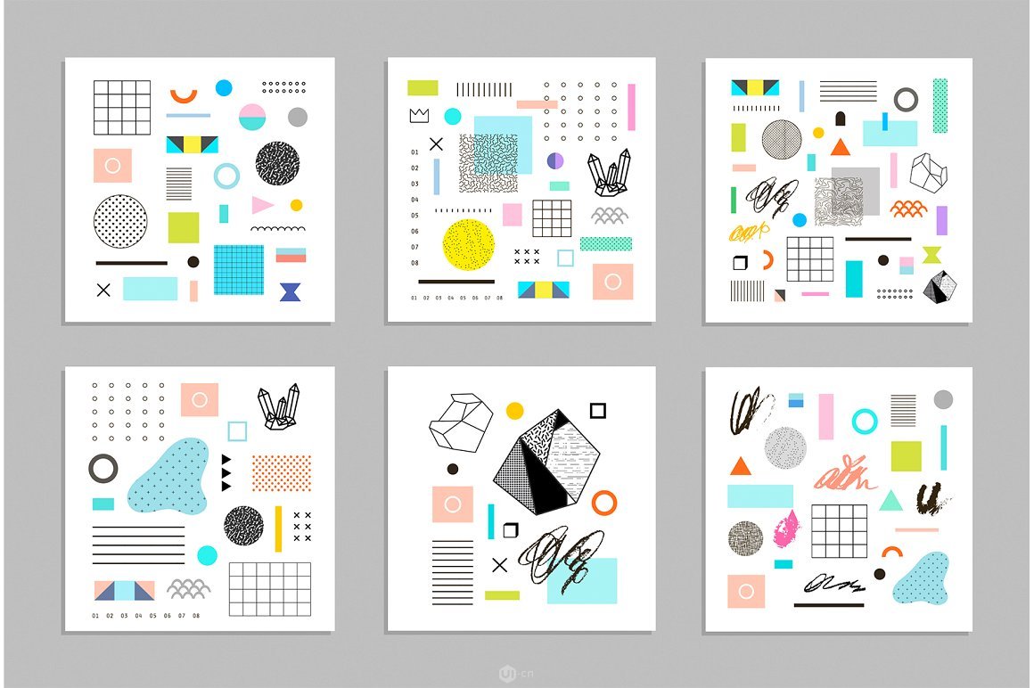 对于图案的把握会和其他的设计有所不同,孟菲斯在设计背景中采用了偏凌乱和自由的方式。细瘦、笔直的线,与凌乱、大量的点以及3D结构图形,结合起来形成鲜明的对比。