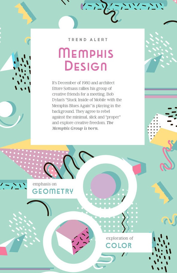 “孟菲斯”的设计都尽力去表现各种富于个性化的文化内涵,从天真滑稽直到怪诞、离奇等不同情趣。在色彩上常常故意打破配色规律,喜欢用一些明快、风趣、彩度高的明亮色调,特别是粉红、粉绿等艳俗的色彩。”—索特萨斯。孟菲斯设计是一种时下流行的设计风格,它即拥有现代设计的特征,也包含复古设计的元素。最初孟菲斯风格来源于室内设计和纺织品设计,是由80年代的许多意大利设计师所组成的孟菲斯集团所开创的一种风格。孟菲斯设计风中涵盖了包括波普艺术、装饰艺术和复古风在内的多种设计风格。
